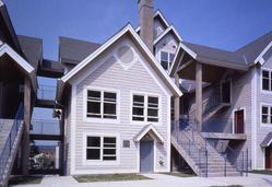 -no shared/common walls - most units are thru-floor "flats" - with maximum natural light and ventilation (huge double-hung windows); even though there are up to 4 units per level, the project uses 3 distinct "buildings" to allow for maximum unit separation.