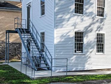 Handicapped accessibility was meshed with the recently added second means of second-floor egress. A steel set of steps was moved to comport with required dimensions and to integrate with new steps that responded to the new walkway access. Use of an inclined walkway, with a shallower pitch (1 in 20) than a "ramp" (1 in 12), meant no handrails and minimal barrier railings. A viably accessible bath was built within existing walls.