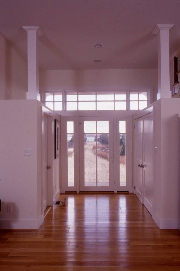 The home utilizes stock windows, simple siding and some expressive eaves.  To recognize the fact that the home sits on an isthmus and has views in both directions (north and south), large windows were employed on both north and south facades.  Seen from great distances from both Long Island Sound and Gardiner’s Bay, the shapes and detailing accepted the challenge of distant apprehension.